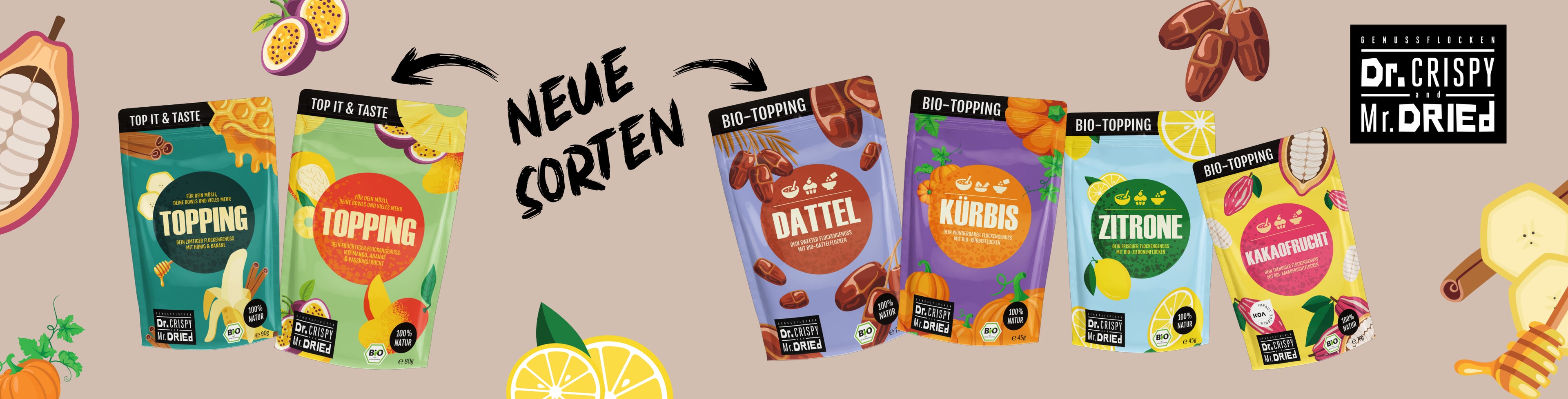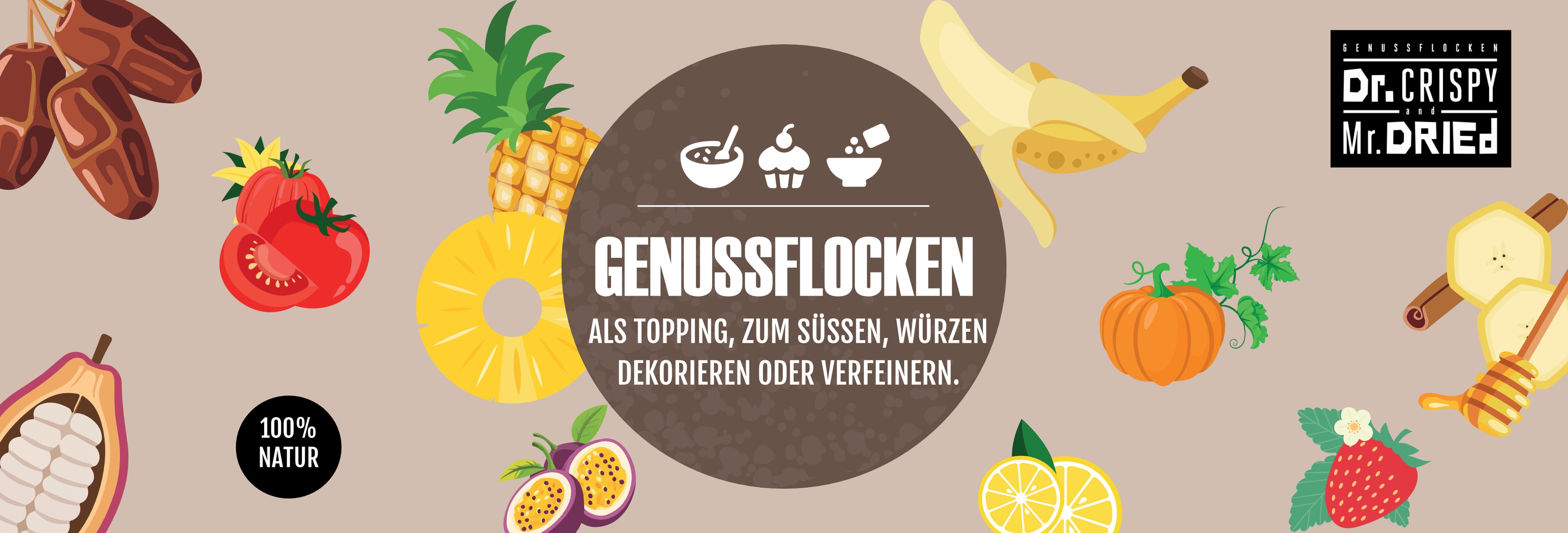 Dr. Crispy & Mr. Dried haben sich für dich ganz schön ins Zeug gelegt. Unsere Bio Genussflocken schmecken nicht nur verdammt gut, sie erfüllen auch höchste Ansprüche an Qualität und Kreativität. Hä? Kreativität?! Ja genau, denn damit kannst du nicht nur dein Müsli toppen und aromatisch veredeln, sondern auch Salate, Suppen, Soßen und was dir sonst noch alles einfällt. Deiner Fantasie sind hierbei keine Grenzen gesetzt. Würze, toppe und verfeinere dich in den siebten Genusshimmel. Ganz egal ob als Topping, Eistopping, Müslitopping, für Pizza, Pasta und Curry, als Vor-, Haupt- oder Nachspeise – Dr. Crispy & Mr. Dried haben für jeden Geschmack das Passende parat und das alles 100 % bio, vegan und ohne Zusatzstoffe. Also sei kreativ und flock dich in den Genuss!