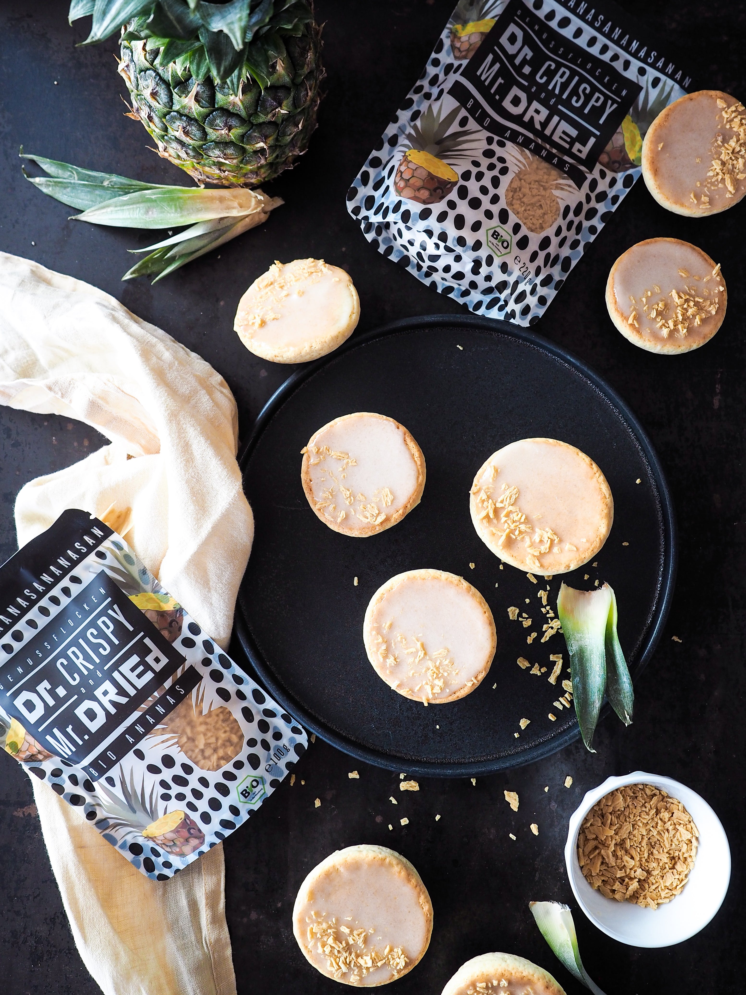 Für die Glasur den Puderzucker zusammen mit den gemahlenen Genussflocken Bio Ananas in eine Schüssel geben. Zitronensaft zugeben und mit so viel Wasser verrühren, bis eine zähflüssige Glasur entstanden ist. Diese auf die Unterseite der Amerikaner aufstreichen und mit den Genussflocken Bio Ananas verzieren.