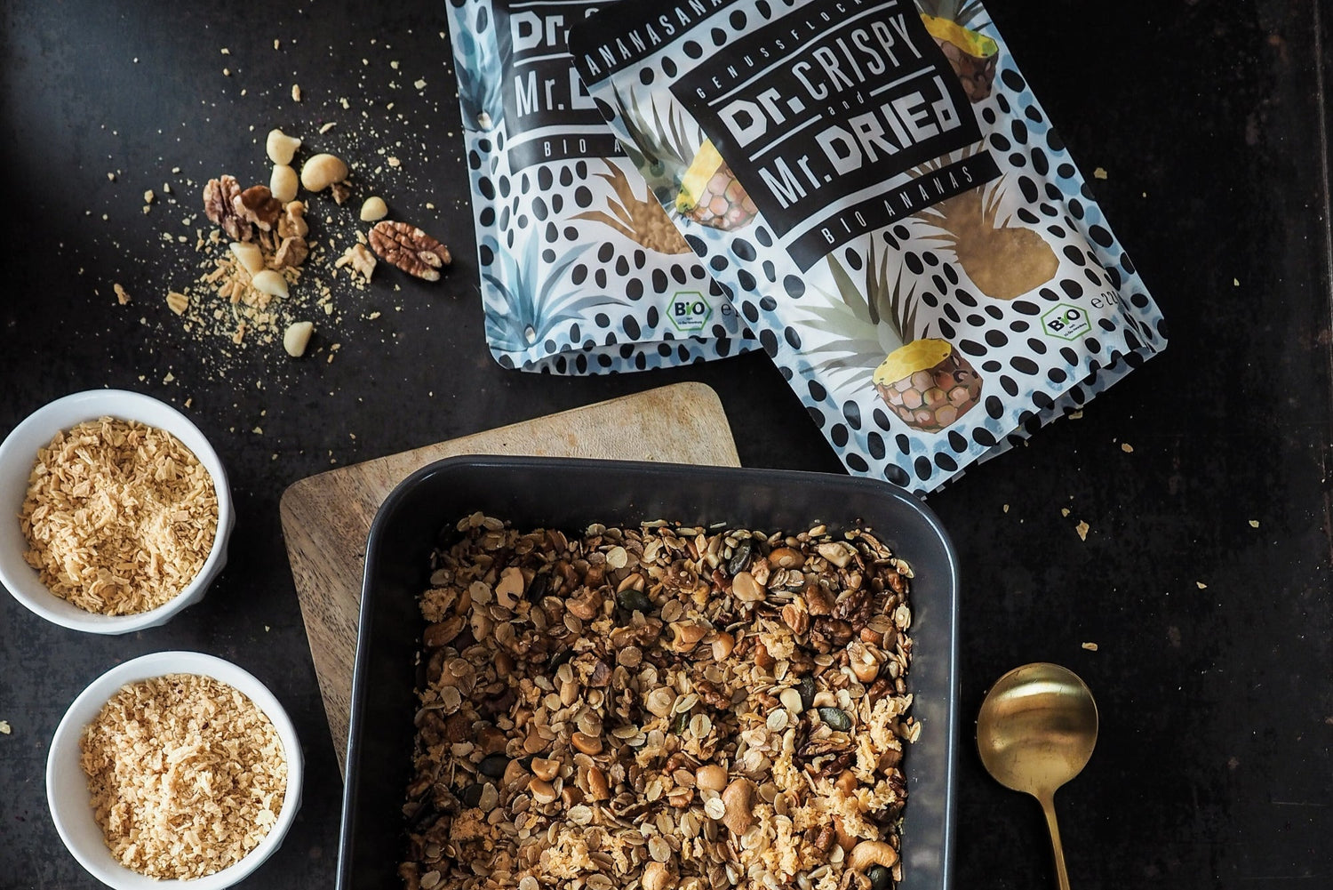 Herausnehmen und sofort die Genussflocken Bio Ananas und Agave unterrühren. Auf dem Backblech auskühlen lassen und dann in einem Vorratsglas aufbewahren.