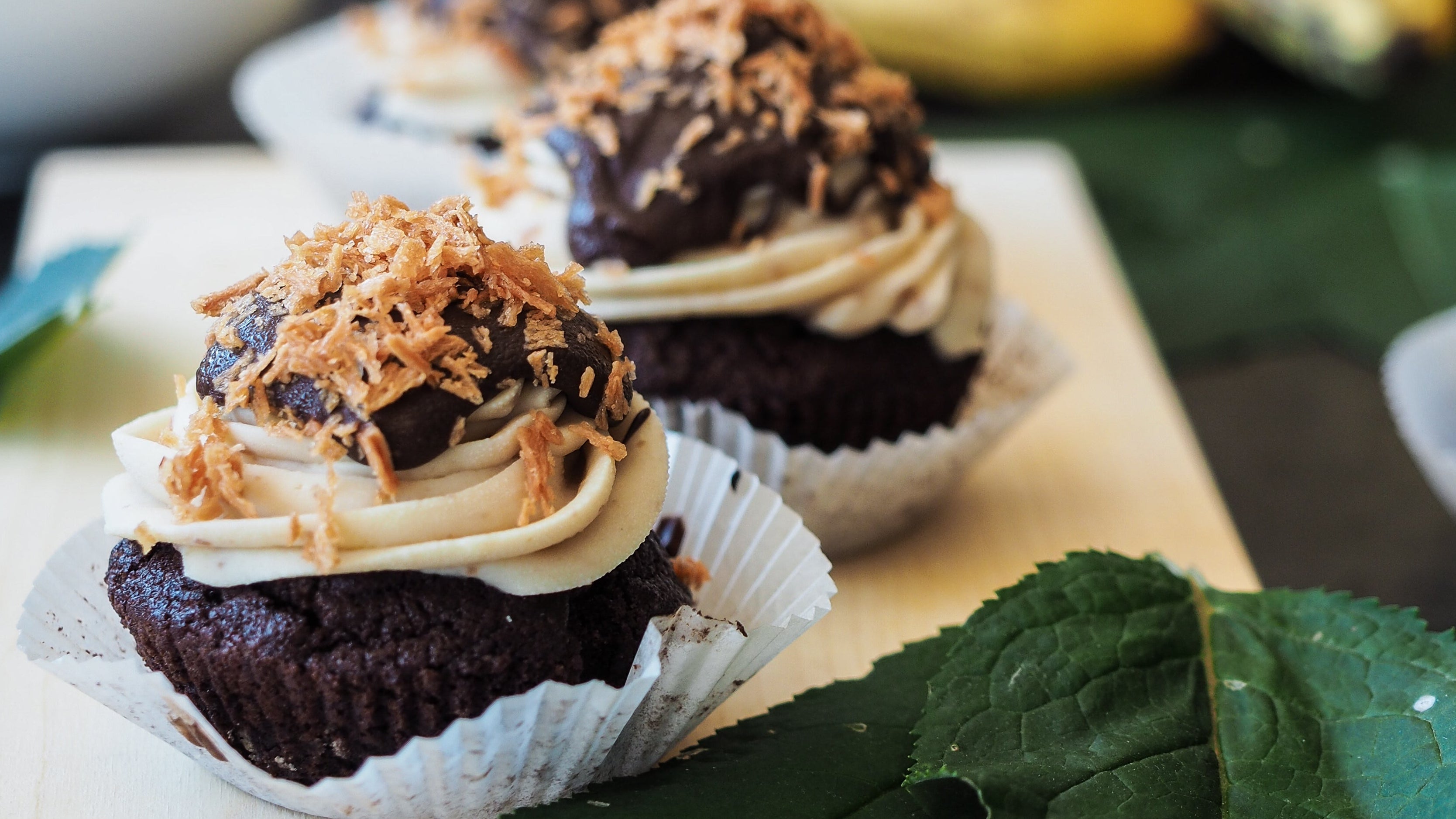 Die Cupcakes damit verzieren. Kühl stellen. Die Zartbitterkuvertüre über dem Wasserbad schmelzen und die Cupcakes damit übergießen, mit Genussflocken Bio Banane bestreuen.