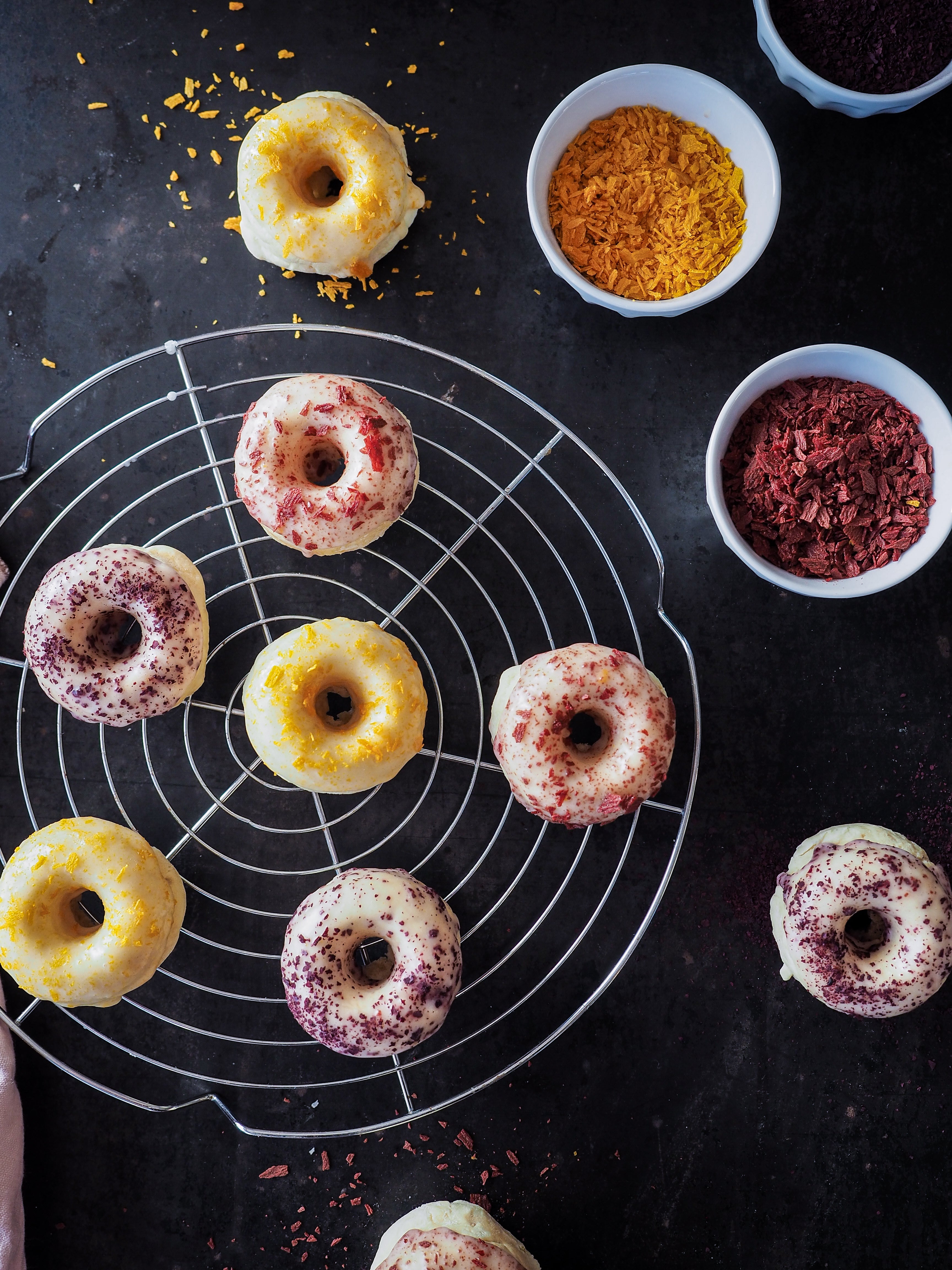 Farbenfroh, fluffig und natürlich dekoriert – unsere bunten Donuts mit einer farbigen Glasur aus Genussflocken von Erdbeere, Mango und schwarzer Karotte bringen gute Laune auf den Teller: ideal für Kindergeburtstage, Partys oder kreative Backnachmittage – ganz ohne künstliche Farbstoffe, perfekt zum natürlichen Einfärben von Lebensmitteln.
