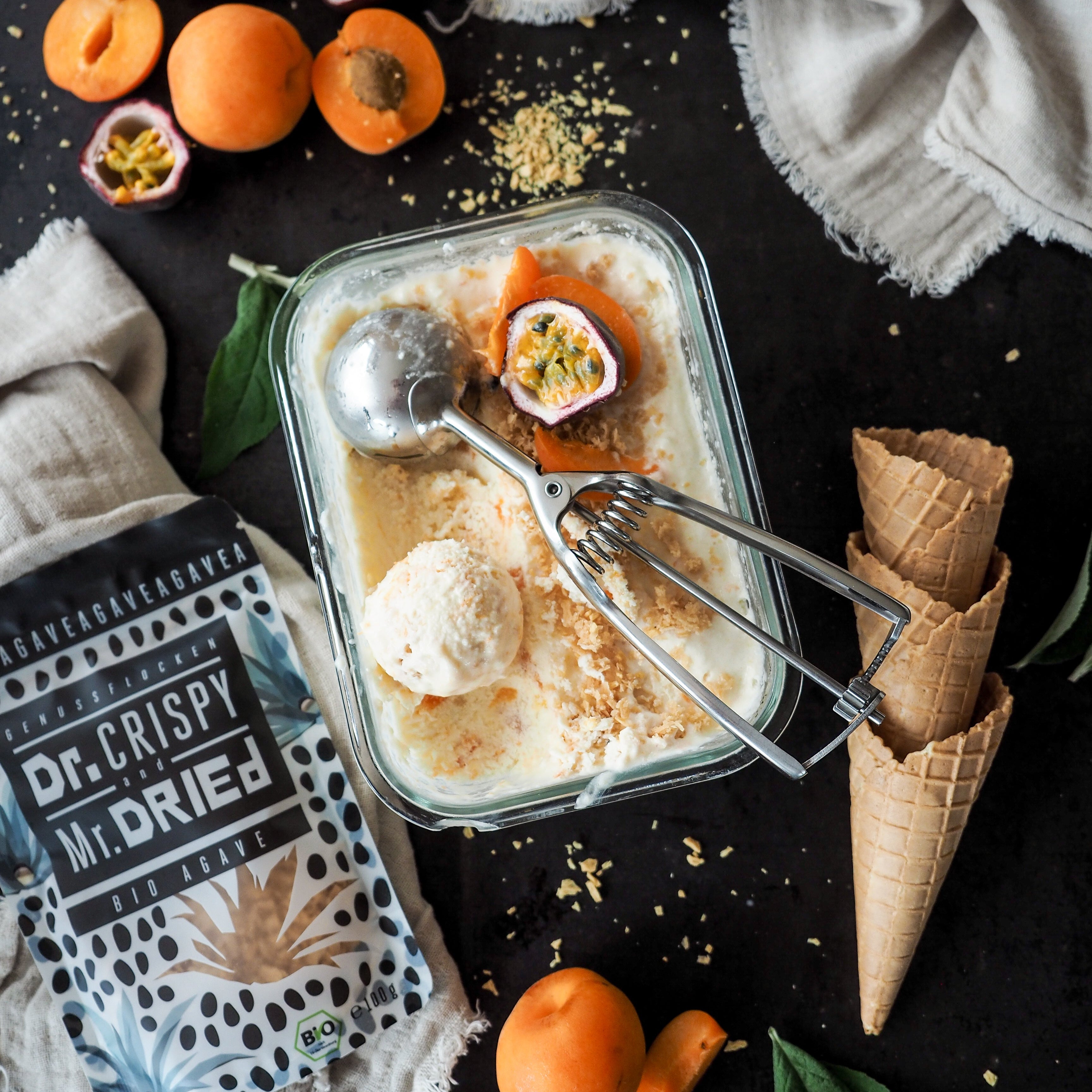 Für das Eis die Genussflocken Bio Agave zusammen mit dem Wasser in den Mixer geben und für 10 min einweichen lassen, dann mixen. Die Sahne und den Joghurt unterrühren.