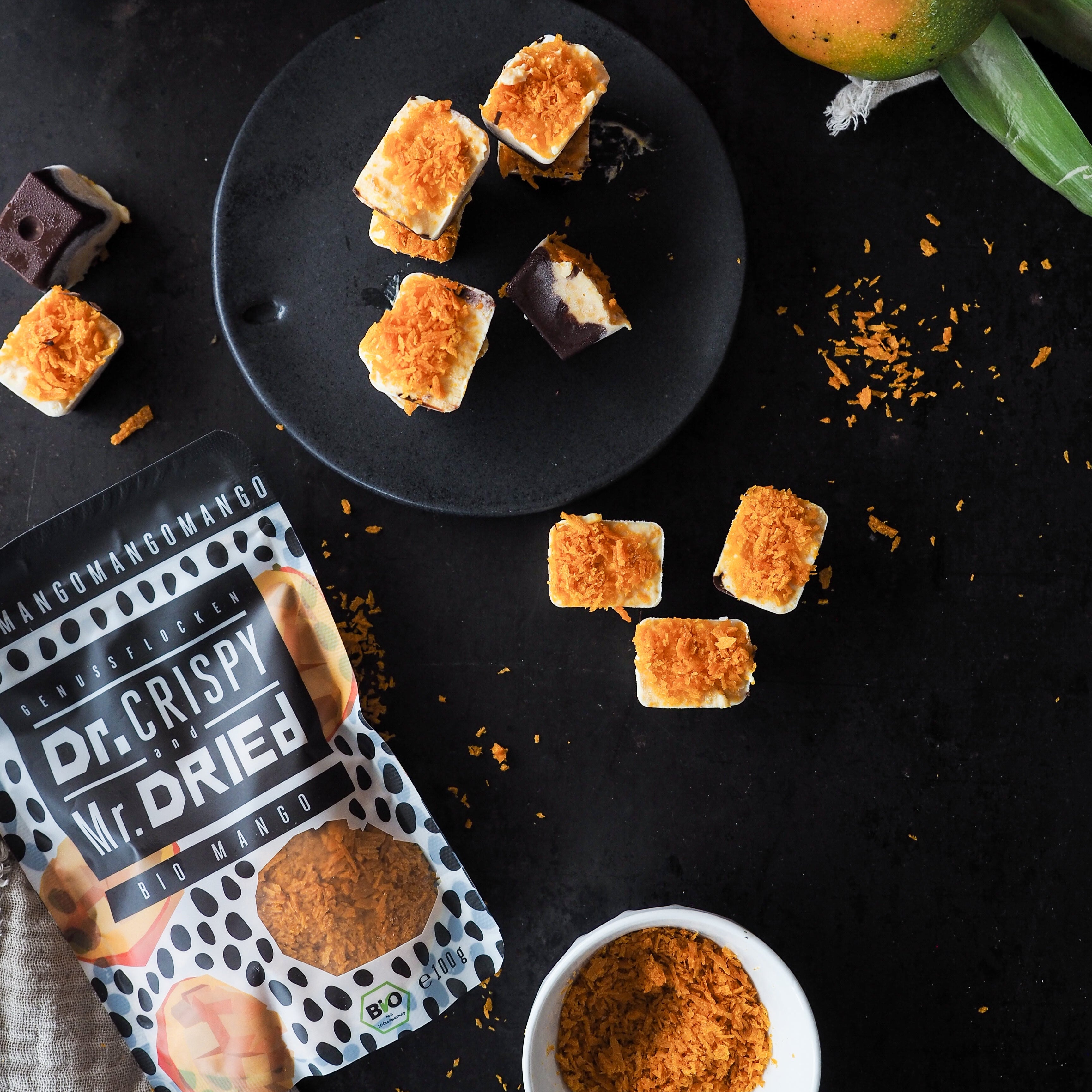Mit Genussflocken Bio Mango und Genussflocken Bio Ananas dekorieren. Wenn gewünscht vorab mit etwas Kuvertüre bestreichen.