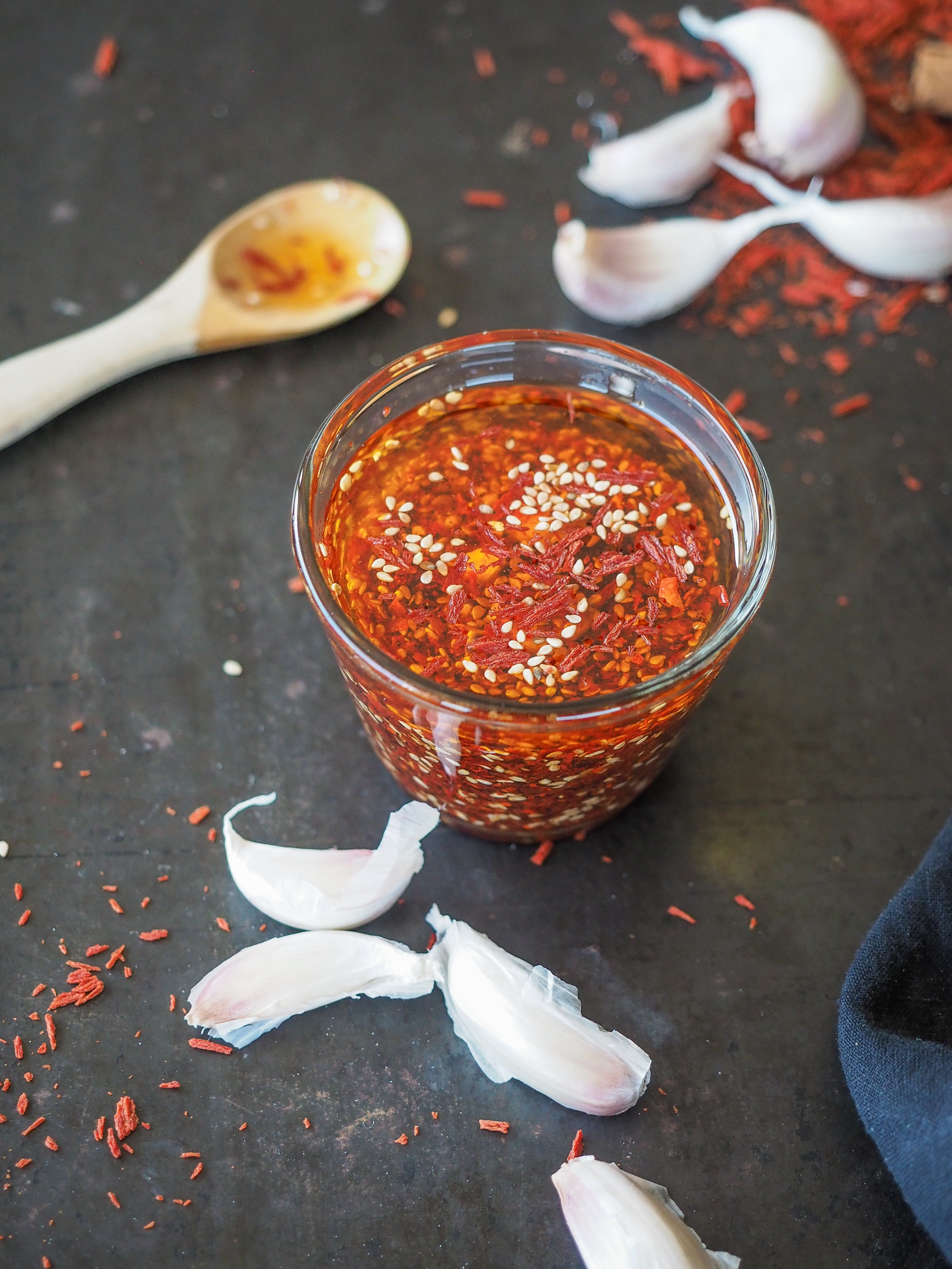 In einer ofenfesten Schüssel die Chili-Flocken, den Sesam, den Zucker verrühren, mit dem heißen Öl übergießen und gut verrühren. Achtung, das zischt und brodelt und ist sehr heiß!