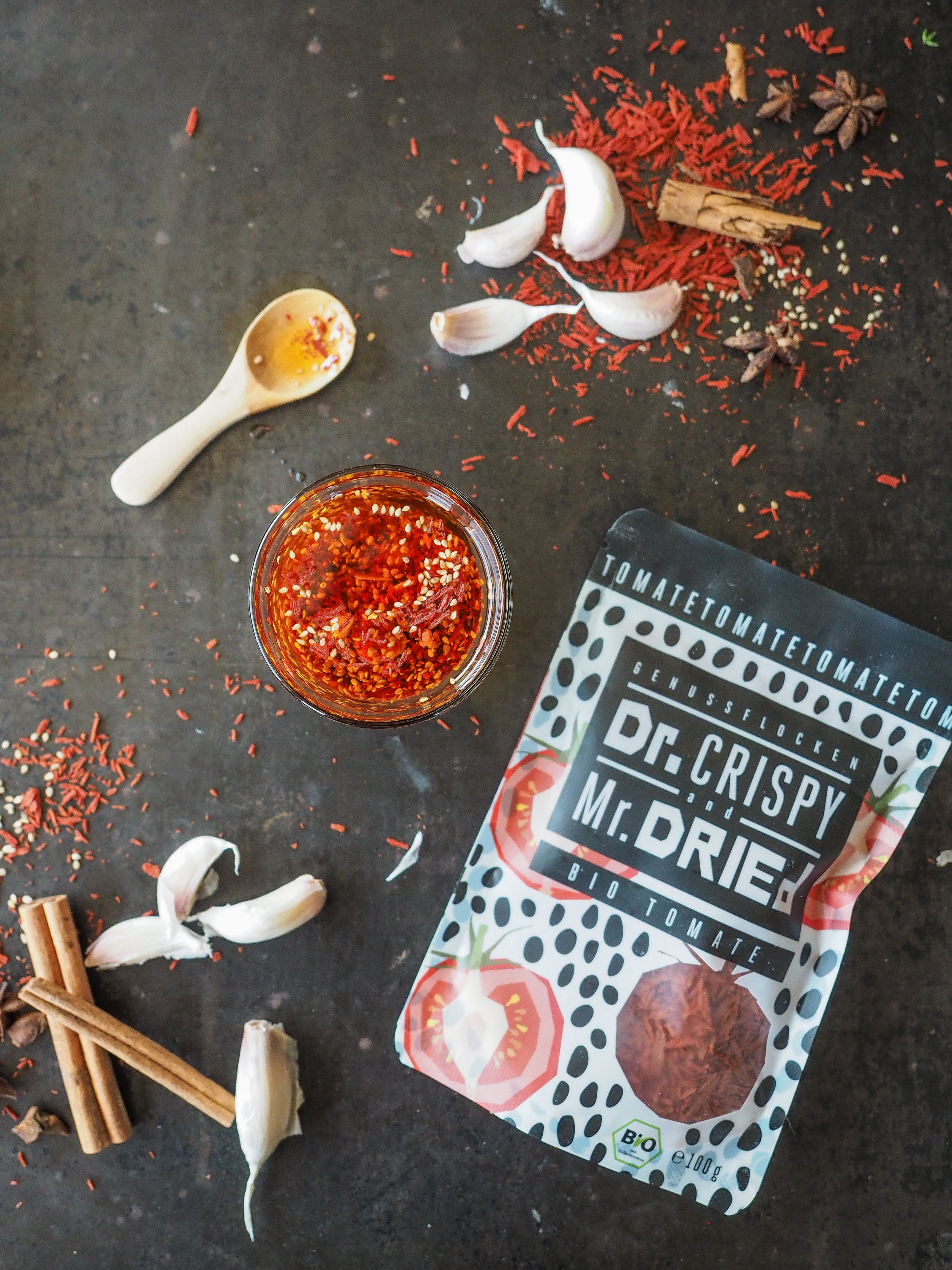Unser fried Chili Öl im Dr. Crispy & Mr. Dried Style mit den Genussflocken Bio Tomate verleiht jedem Gericht den gewissen Kick. Mit den walzengtrockneten Bio Genussflocken Tomate, Chili und Öl entsteht eine aromatische, leicht scharfe Würzkomponente, die perfekt zu Pasta, Bowls, Reis oder auf dem Brot passt. Einfach herzustellen, unglaublich vielseitig – dieses Öl darf in keiner Küche fehlen!