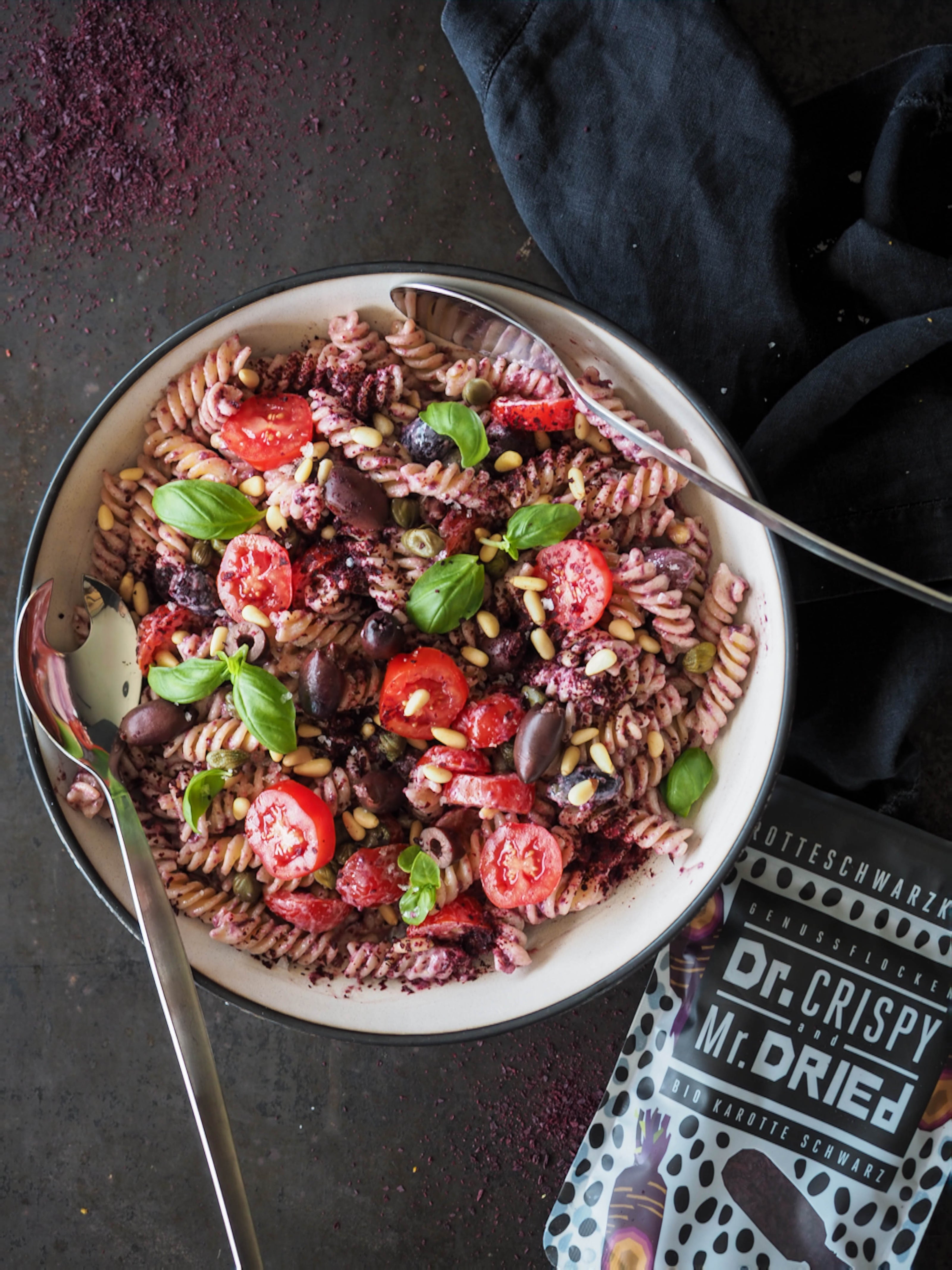 LILA NUDELSALATLILA NUDELSALATFarbenfroh, knackig und überraschend anders – unser Lila Nudelsalat mit den Bio Genussflocken Schwarze Karotte vereint herzhafte Frische mit natürlicher Farbvielfalt. Die walzengetrockneten schwarzen Karottenflocken bringen nicht nur intensiven Geschmack, sondern auch eine leuchtende Optik in das Gericht. Perfekt für Grillabende, Meal Prep oder als bunter Hingucker auf jedem Buffet.