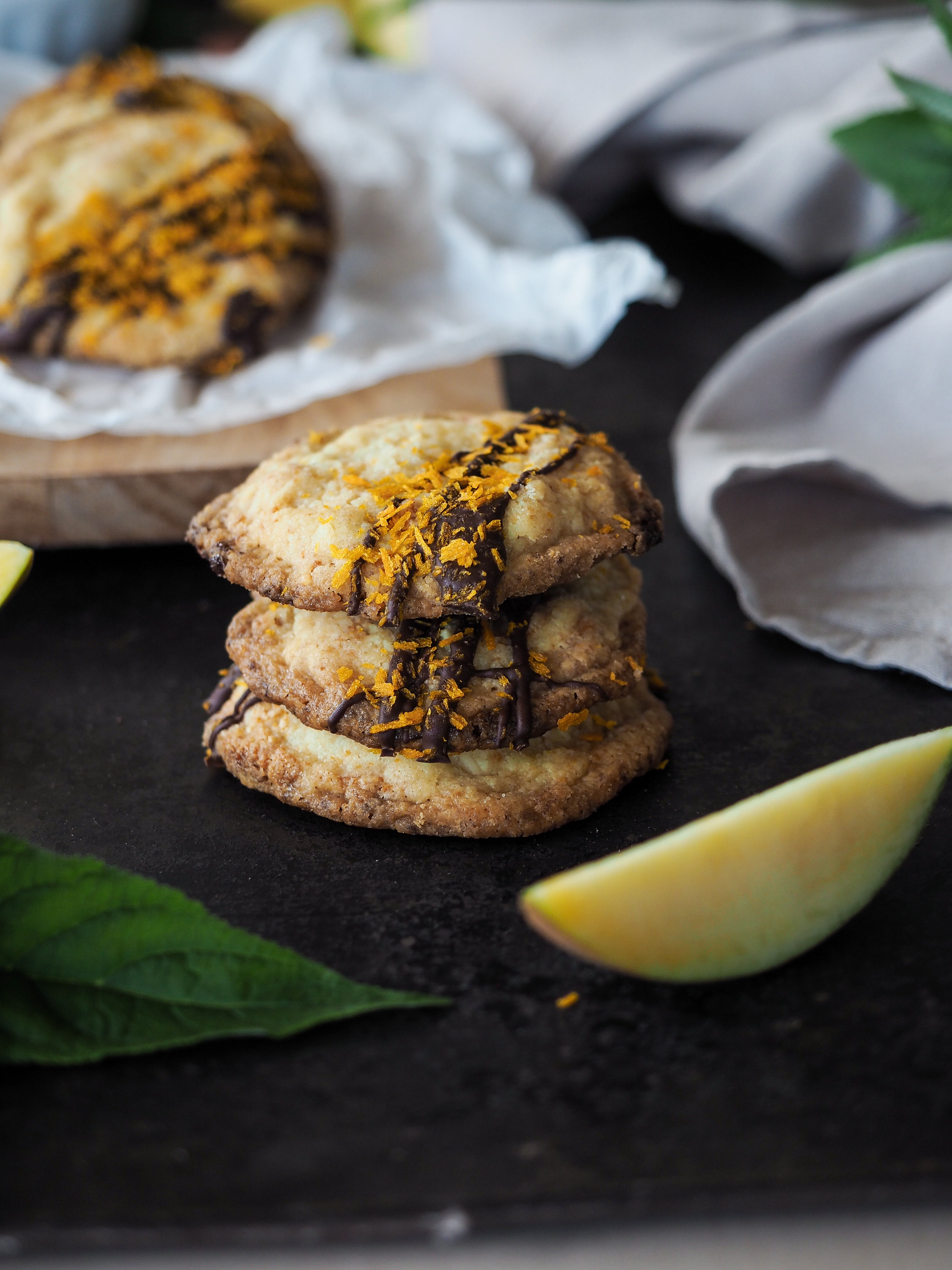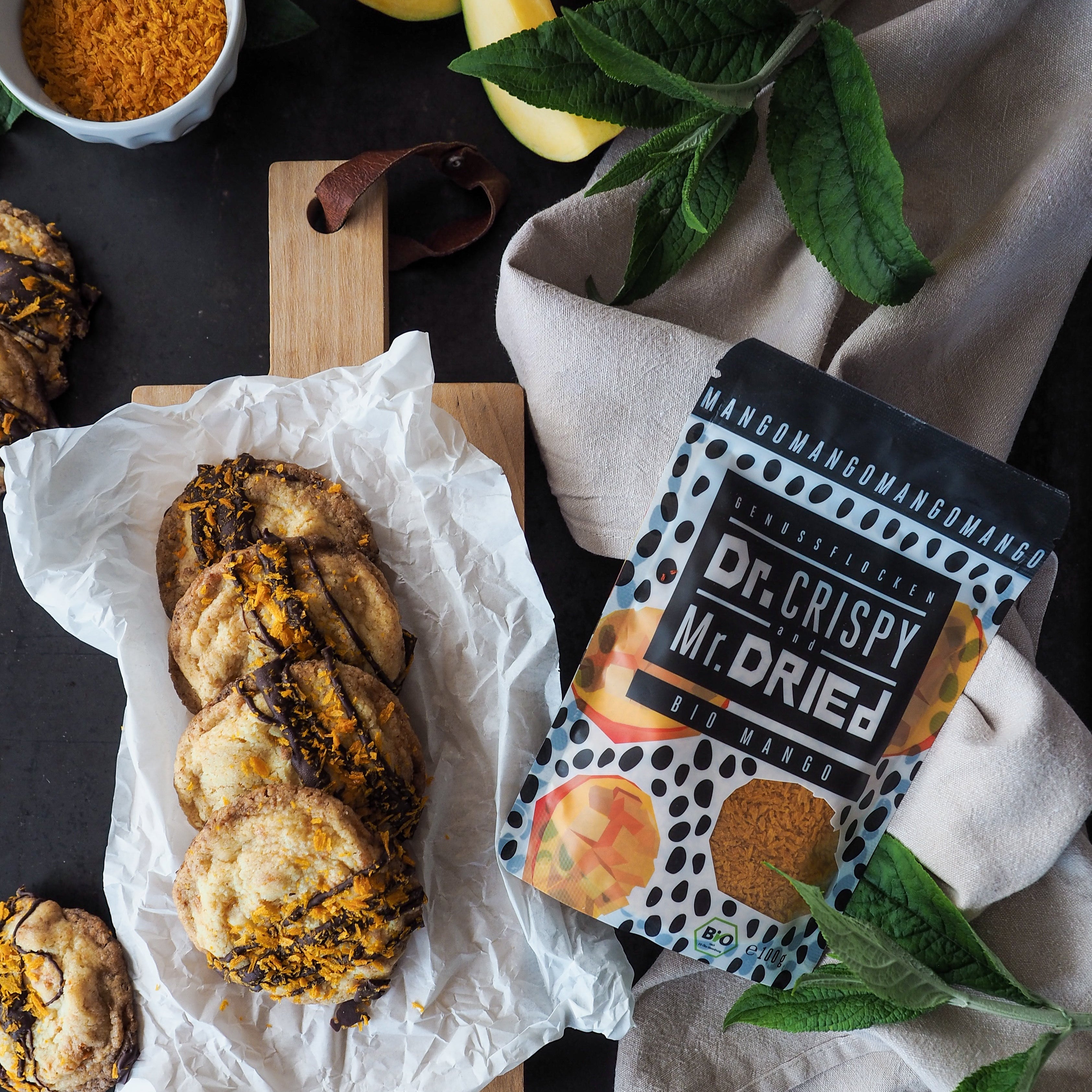 Zum verzieren die dunkle Kuvertüre über dem Wasserbad schmelzen und über die Kekse träufeln, mit Genussflocken Bio Mango bestreuen.