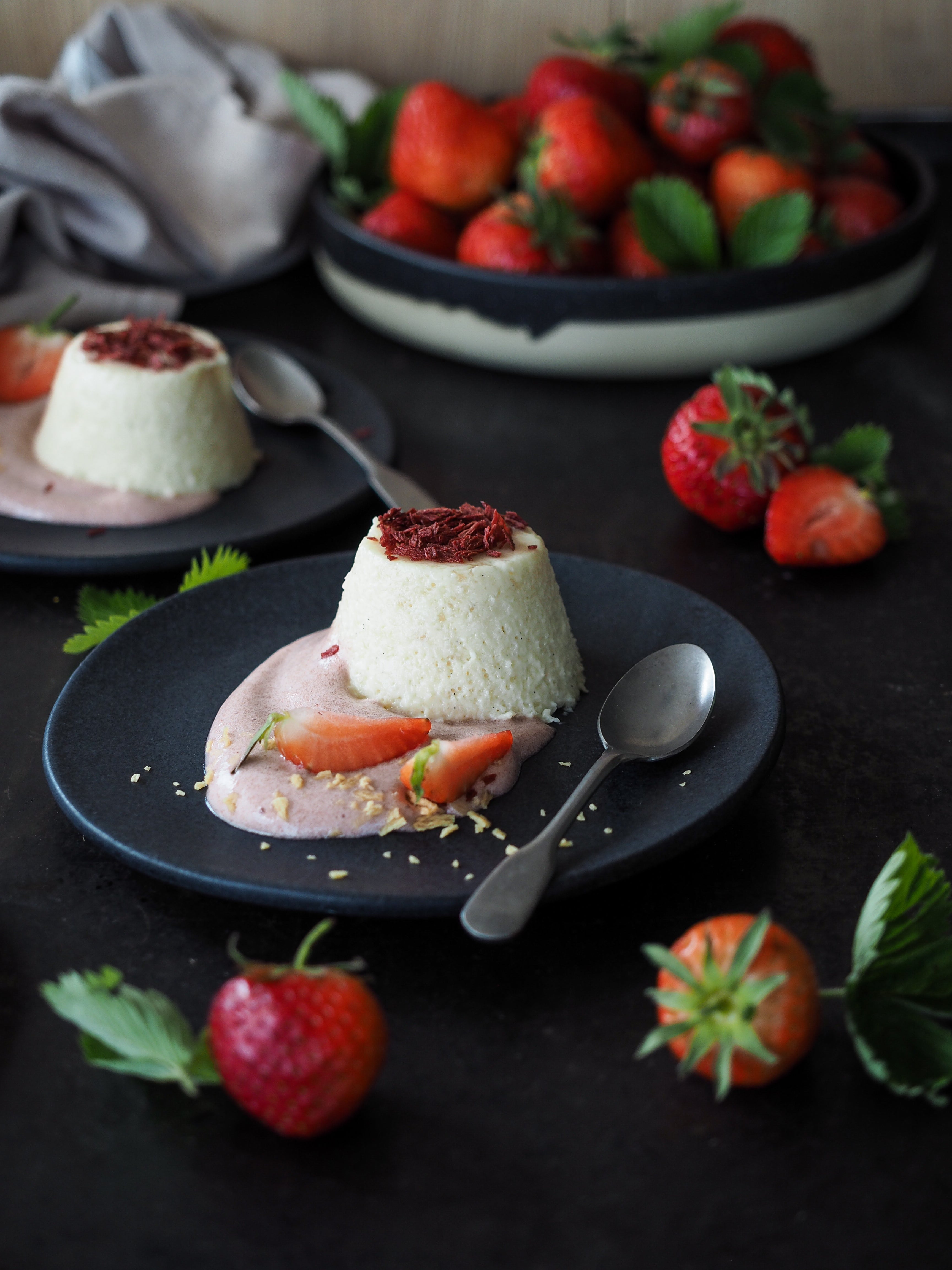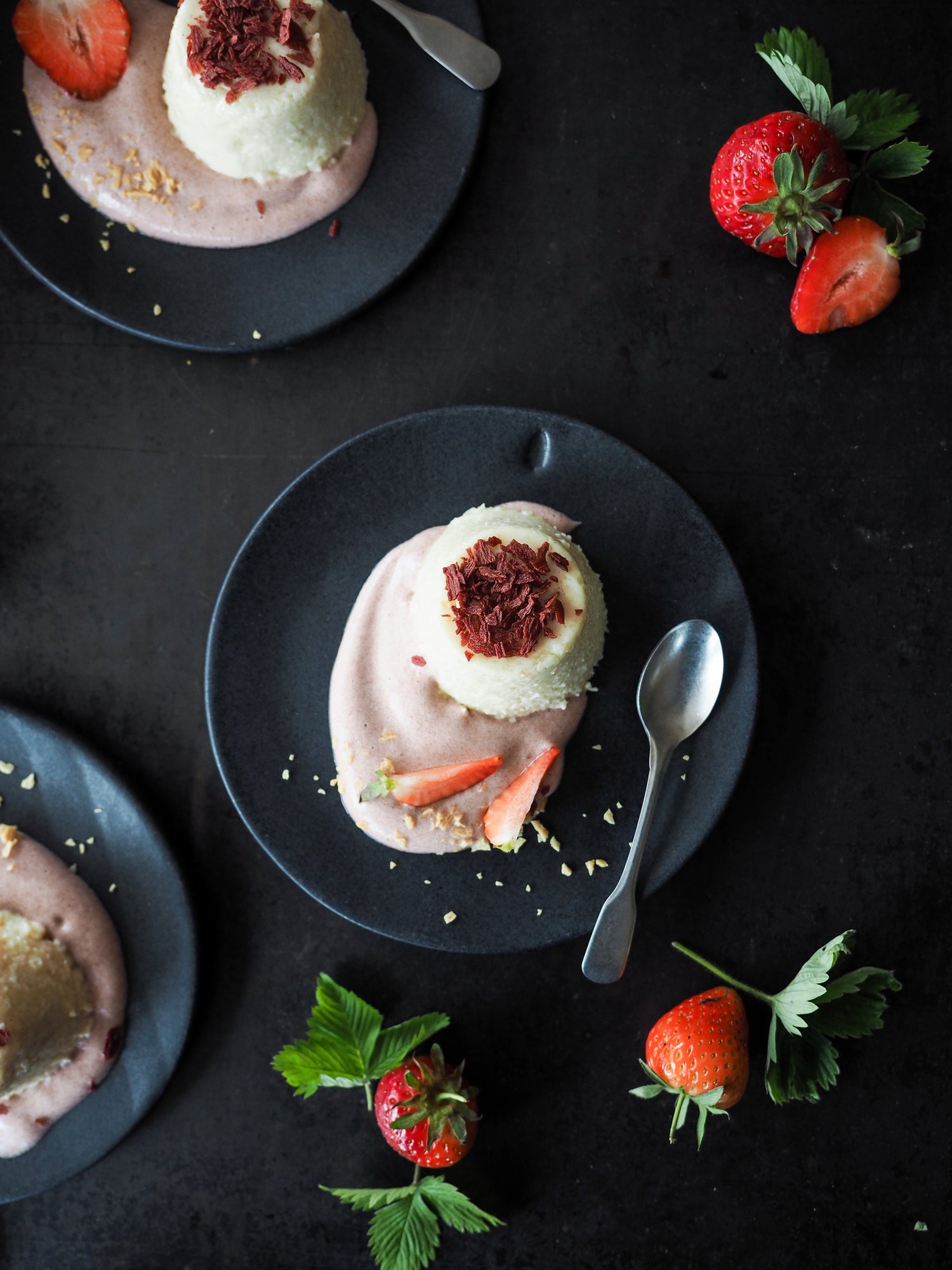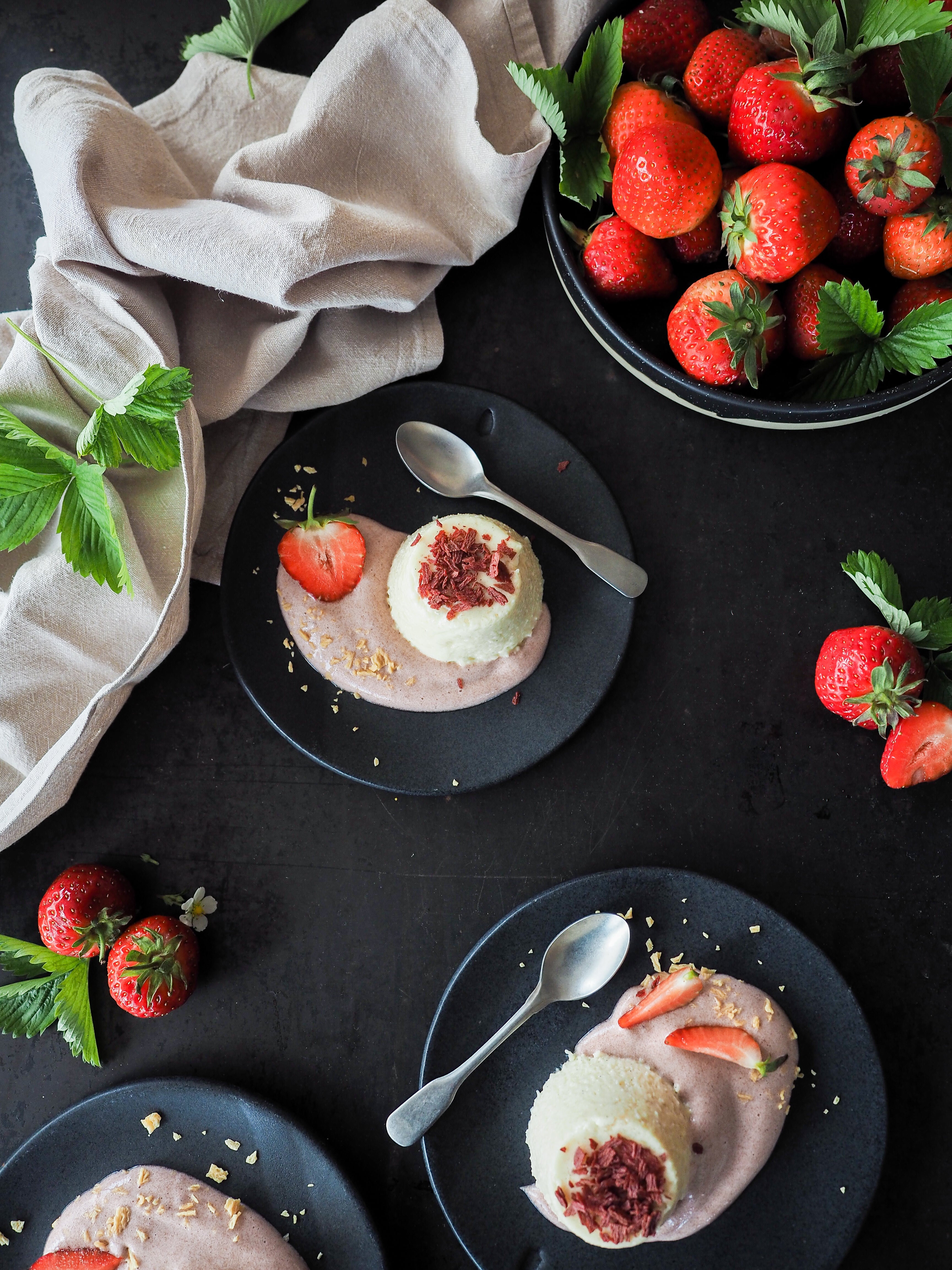 Den Erdbeerschaum auf einem Teller anrichten, die Panna-Cotta aus den Förmchen lösen und auf den Teller stürzen. Mit Genussflocken Bio Erdbeere und Kokosblüte dekorieren und eine halbe Erdbeere auflegen.