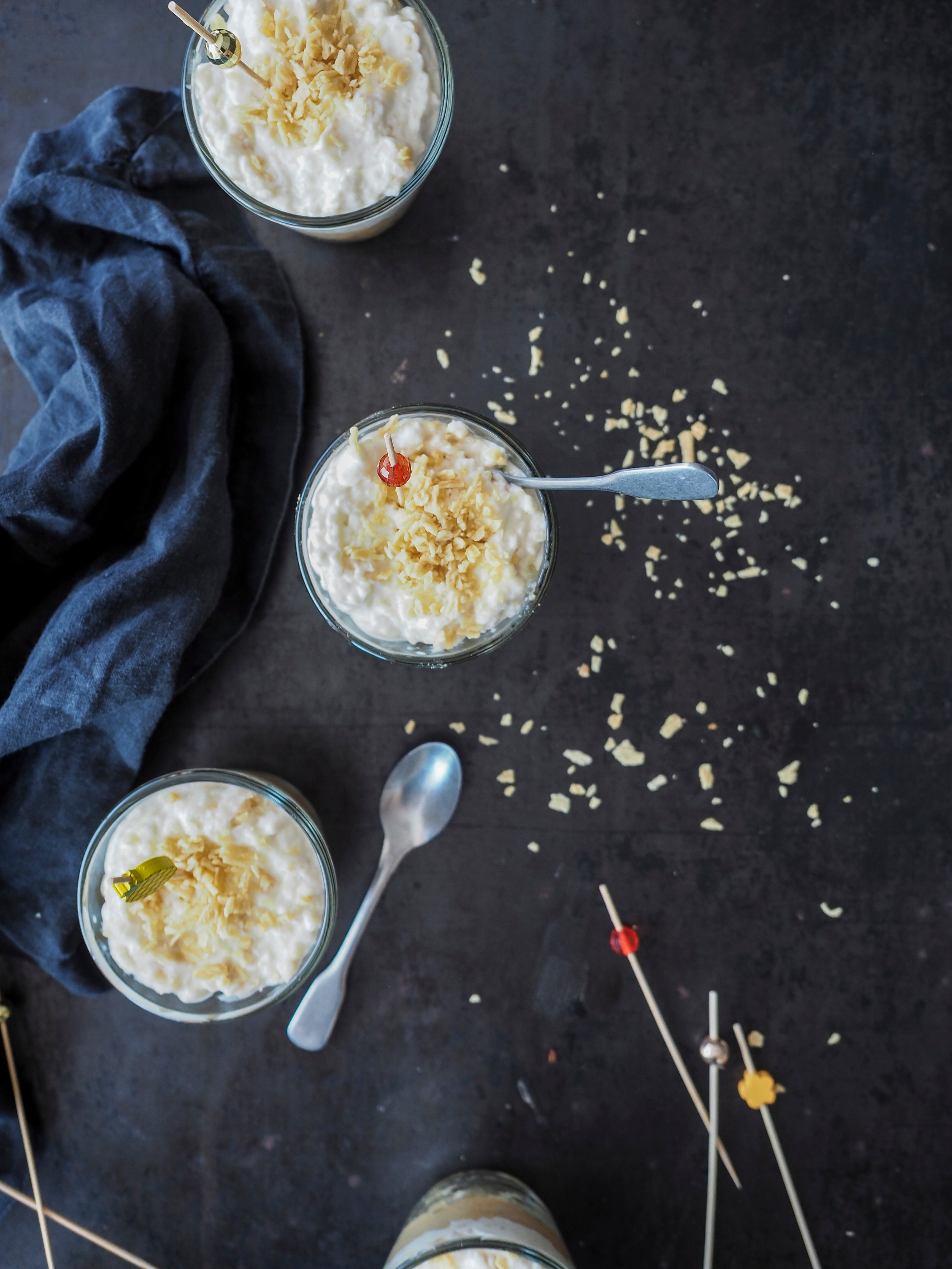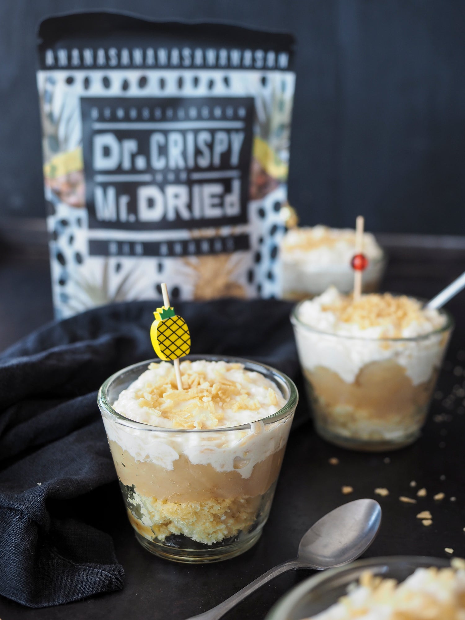 Nun die Desserts schichten. Dazu Kreise aus dem Teig ausstechen und in ein Glas geben. Mit dem Kokoslikör tränken und dann die Fruchtfüllung darauf geben. Mit der Creme bedecken, mit Genussflocken Bio Ananas bestreuen und mit Partyspieß dekorieren.