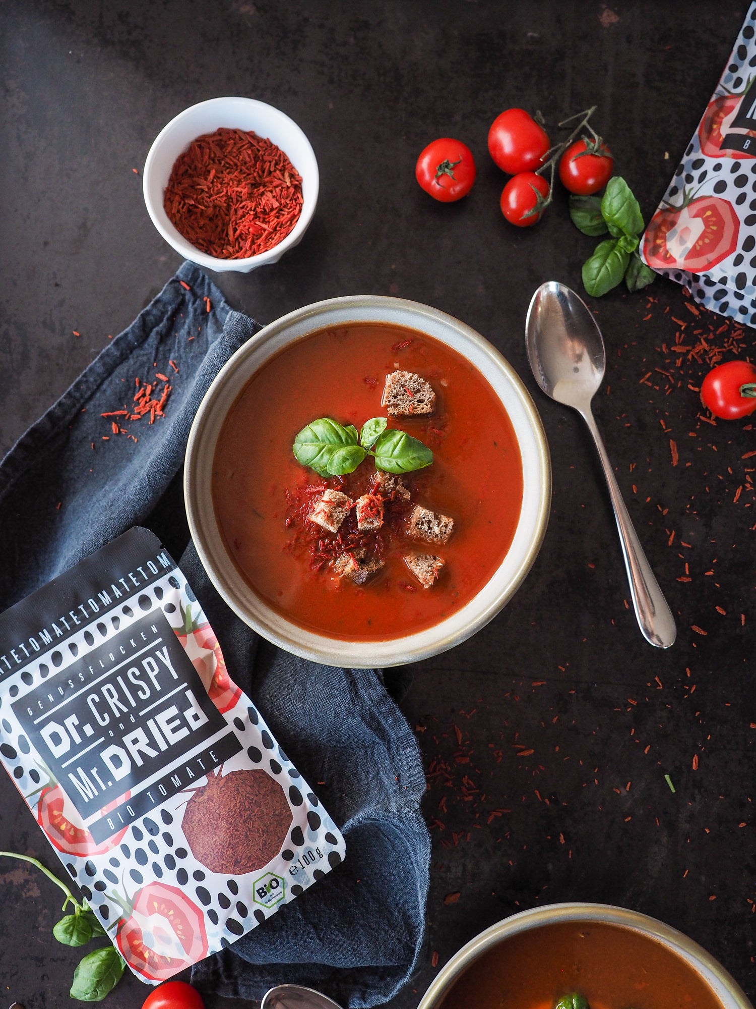Samtig, intensiv und voller mediterranem Aroma – unsere Tomatensuppe mit getrockneten Tomatenflocken ist eine wahre Geschmacksexplosion: ideal als Vorspeise, leichtes Hauptgericht oder wärmende Mahlzeit, die in wenigen Minuten Urlaubsfeeling auf den Tisch bringt.