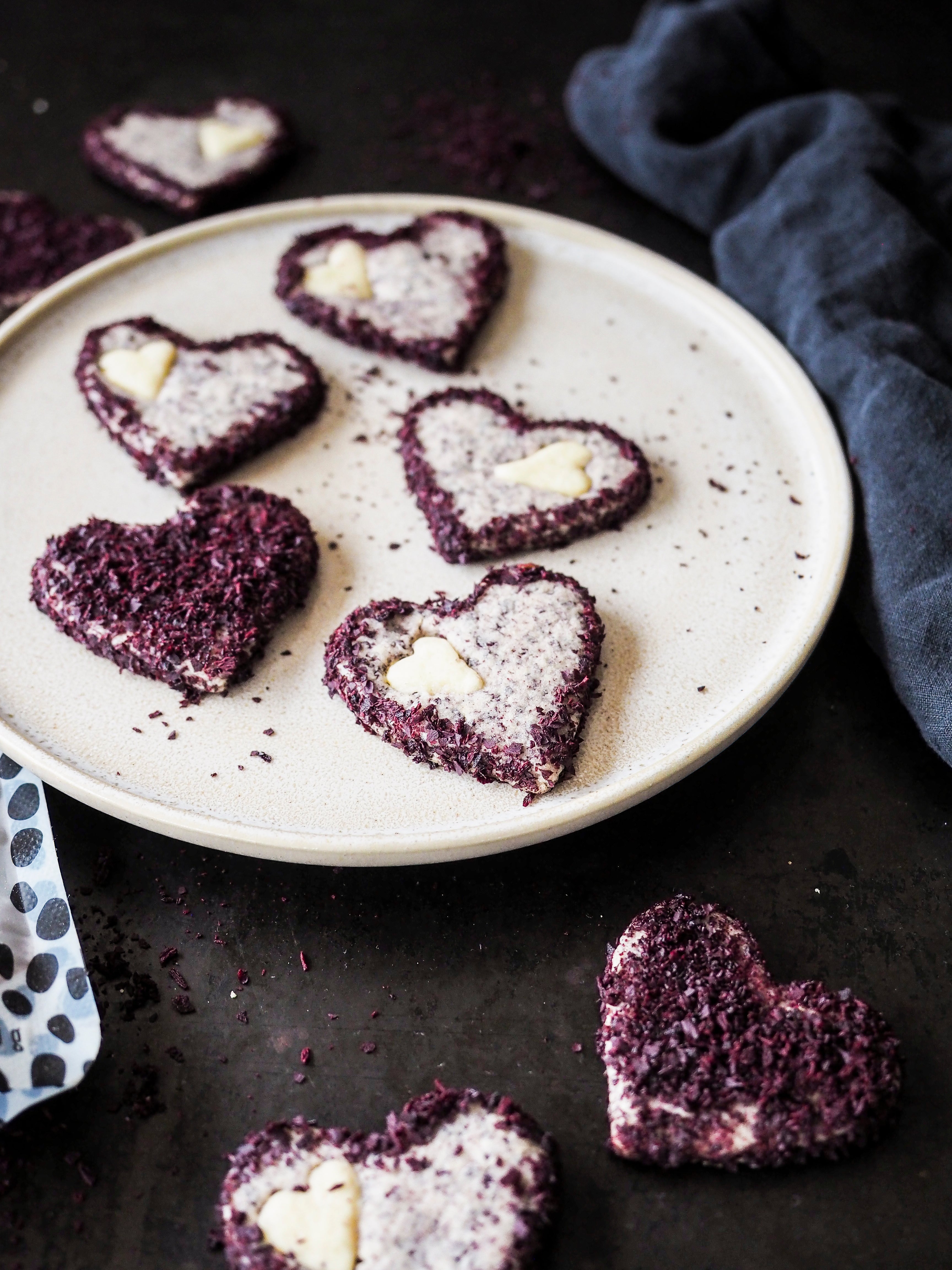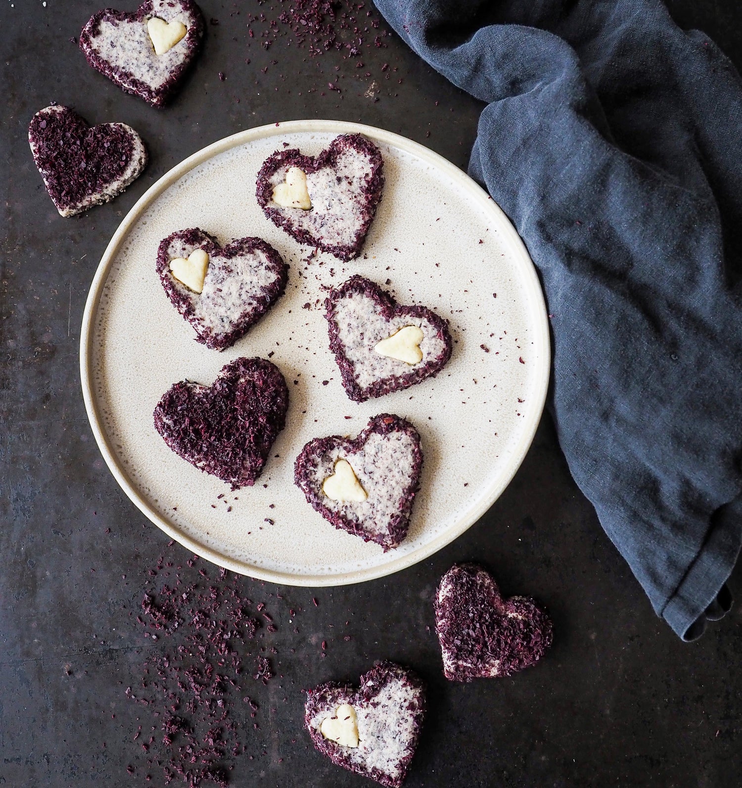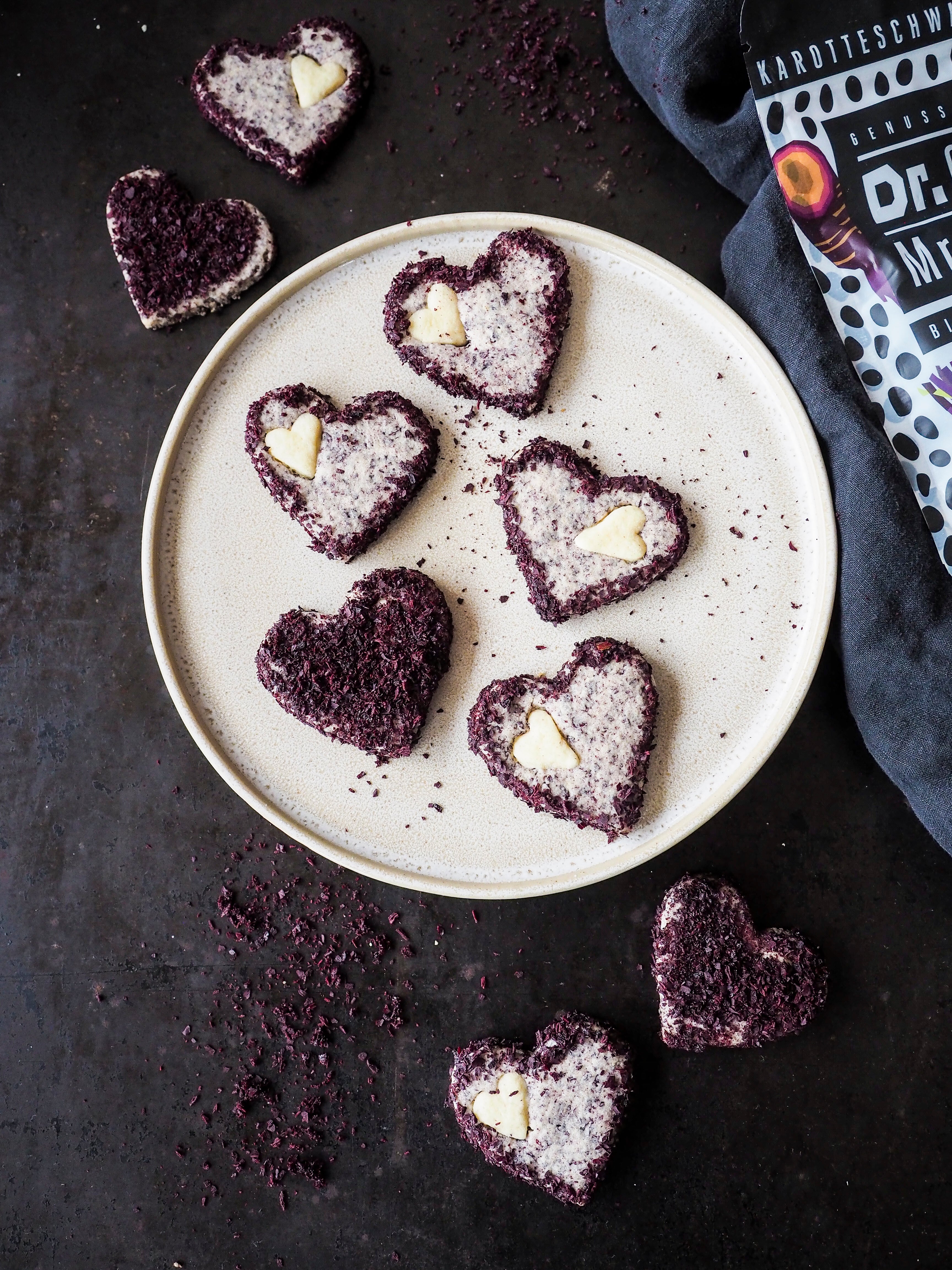 Den Karotten-Teig ausrollen und Herzen ausstechen. Auf ein mit Backpapier belegtes Blech geben und ein kleines Herz ausstechen. Jetzt den hellen Teig ausrollen und kleine Herzen ausstechen. In die Öffnung geben und etwas andrücken. So den ganzen Teig verarbeiten. Entweder helles großes Herz mit kleinem lila Herz oder umgekehrt.