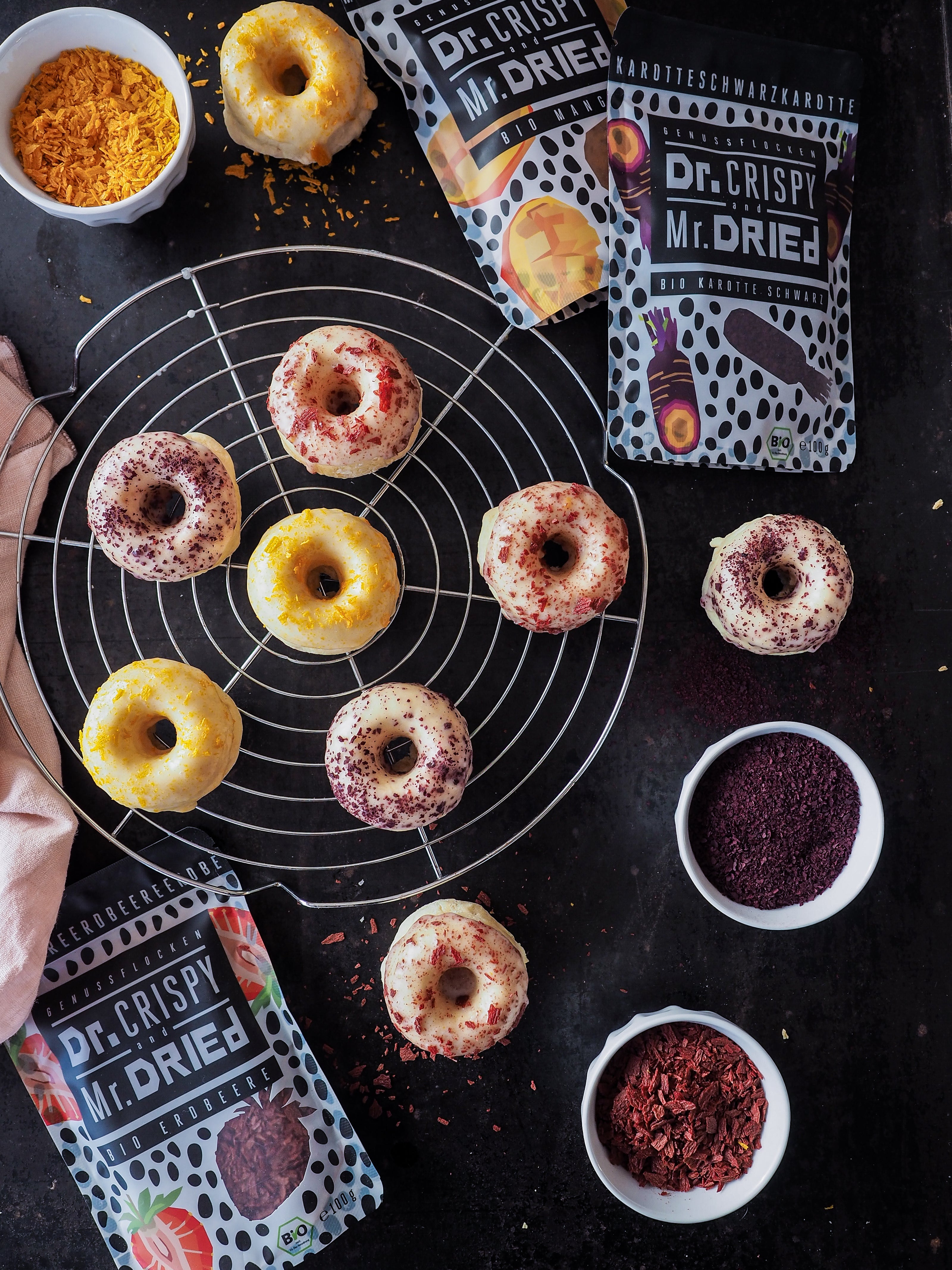 BUNTE DONUTSBUNTE DONUTSFarbenfroh, fluffig und natürlich dekoriert – unsere bunten Donuts mit einer farbigen Glasur aus Genussflocken von Erdbeere, Mango und schwarzer Karotte bringen gute Laune auf den Teller.