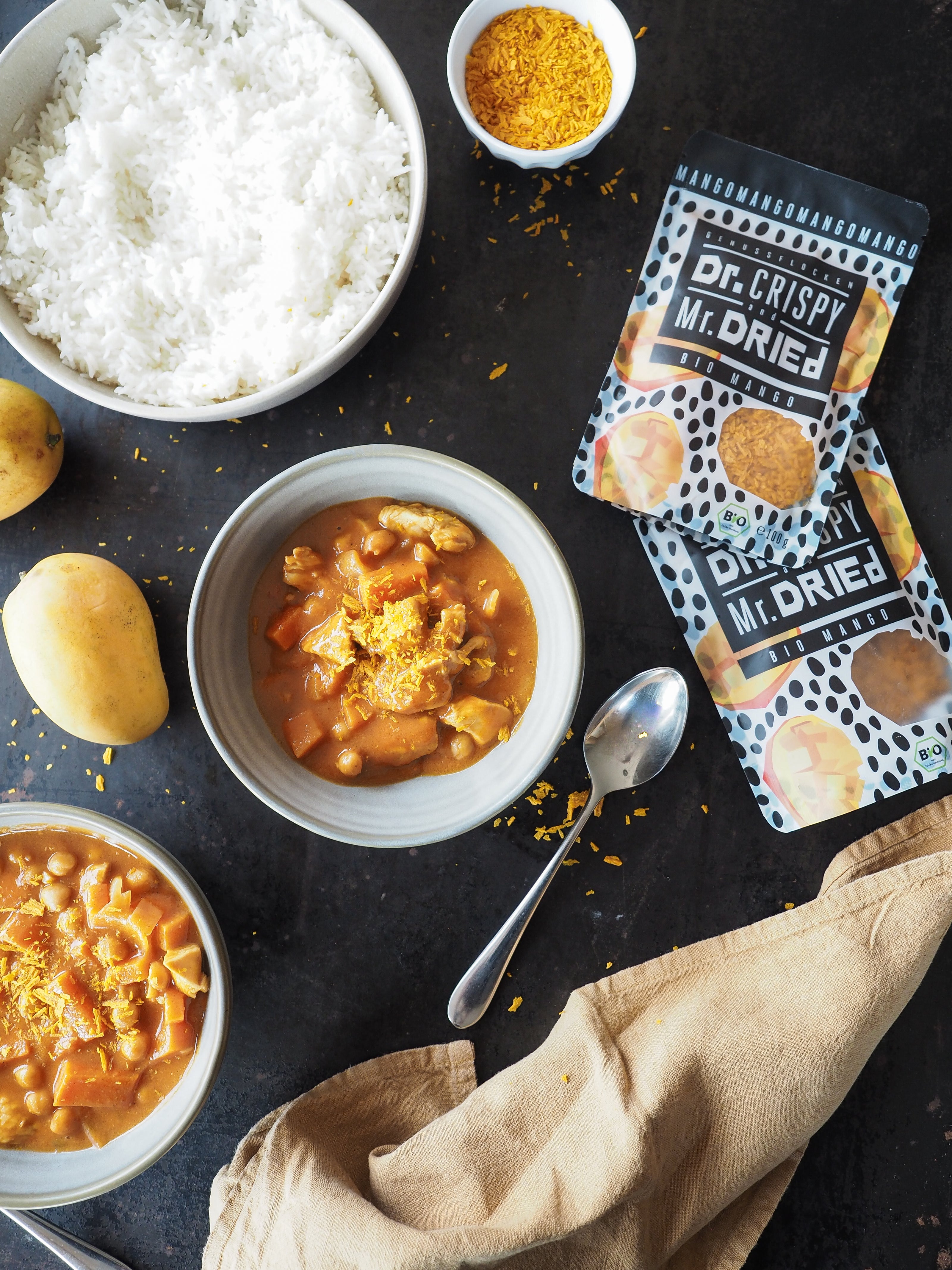 MANGO-HÄHNCHEN-CURRYMANGO-HÄHNCHEN-CURRYFruchtig, cremig und herrlich würzig – unser Hähnchen Mango Curry mit getrockneten Mangoflocken vereint zartes Fleisch mit exotischem Mangogeschmack und feinen Gewürzen.