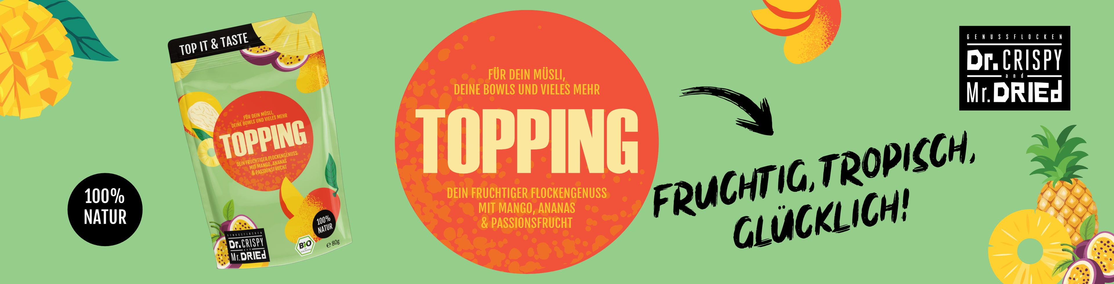 Hol dir das Urlaubsgefühl direkt nach Hause: Unser Bio-Topping aus Mango, Ananas und Passionsfrucht bringt sonnige Leichtigkeit in deine Schüssel,. Streu die exotischen Flocke einfach über Joghurt, Eis, Bowls, Porridge oder Desserts - und zaubere dir im Handumdrehen ein tropisches Highlight, das dich sofort in Sommerlaune versetzt.